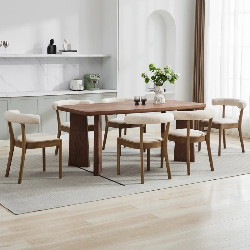 تصميم الأرجل الفريد يكمل المنحنيات الناعمة للكراسي الخشبية الصلبة، بينما يوفر مسند الظهر المدور والتنجيد السميك دعمًا ناعمًا ومريحًا.
