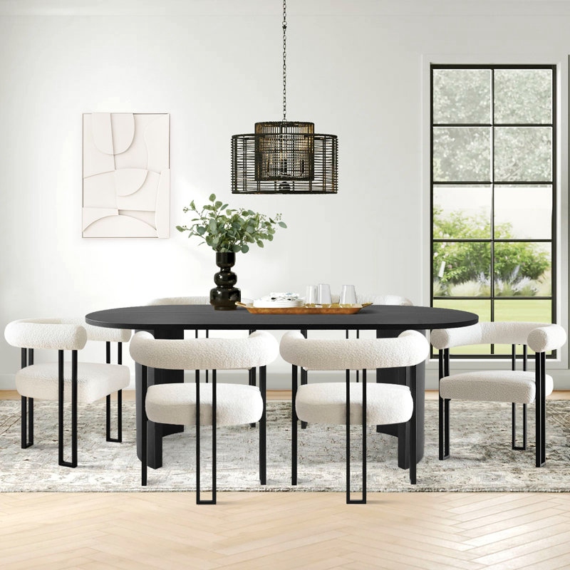 طاولة طعام بوهيمية عصرية بسطح زجاجي شفاف وقاعدة معدنية بشكل عنكبوتي، مثالية لجلسات الطعام العائلية والأصدقاء.