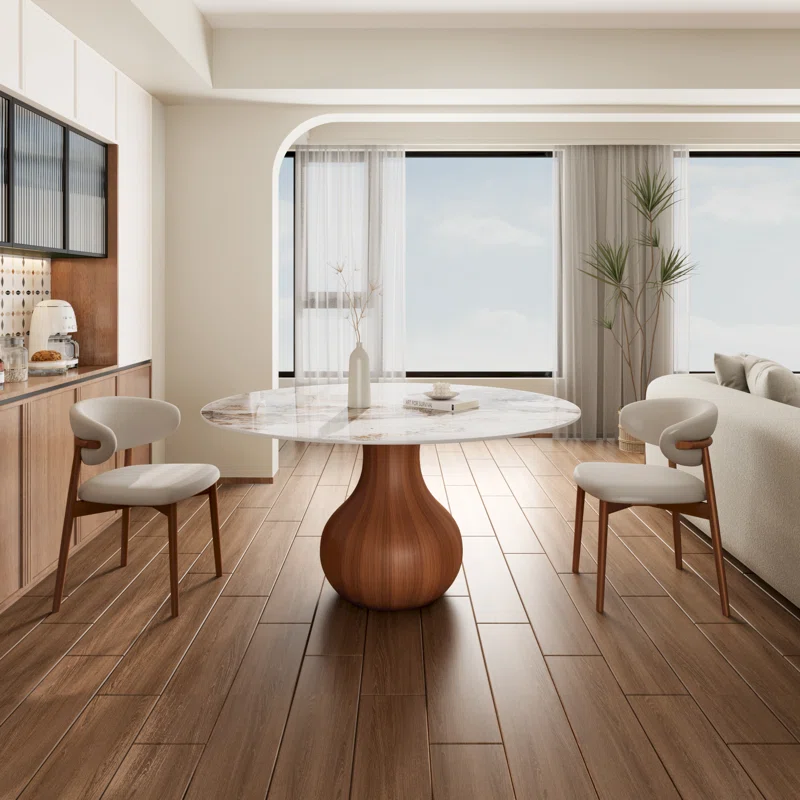 قاعدة مصنوعة من خشب المطاط الصلب (Rubberwood) توفر ثباتًا وأناقة عصرية، وتدعم الطاولة المستديرة بشكل مريح لشخصين.