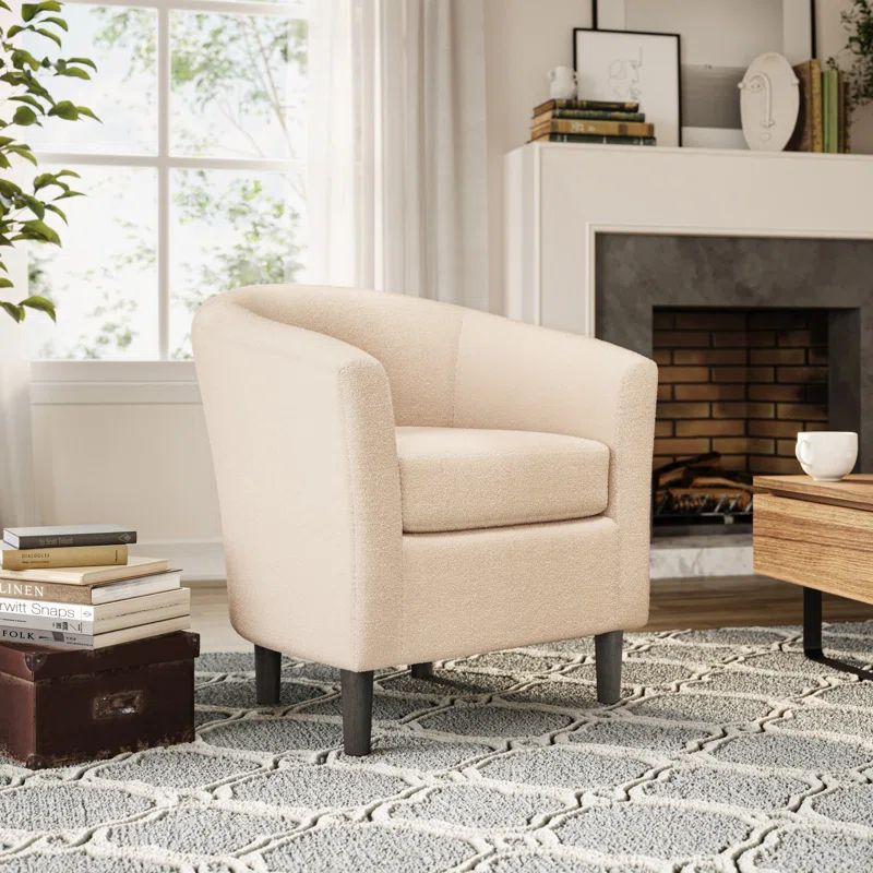 يتميز الكرسي بتصميم برميلي الشكل مع مسند ظهر مقوس وأذرع مائلة بانسيابية، مما يخلق توازنًا مثاليًا بين الأناقة والراحة. توفر الوسائد الإسفنجية عالية الكثافة والتطريز المقوى تجربة جلوس مريحة ومستدامة، بينما تضيف الأرجل المصنوعة من خشب الصنوبر الداكن لمسة راقية وثباتًا قويًا.