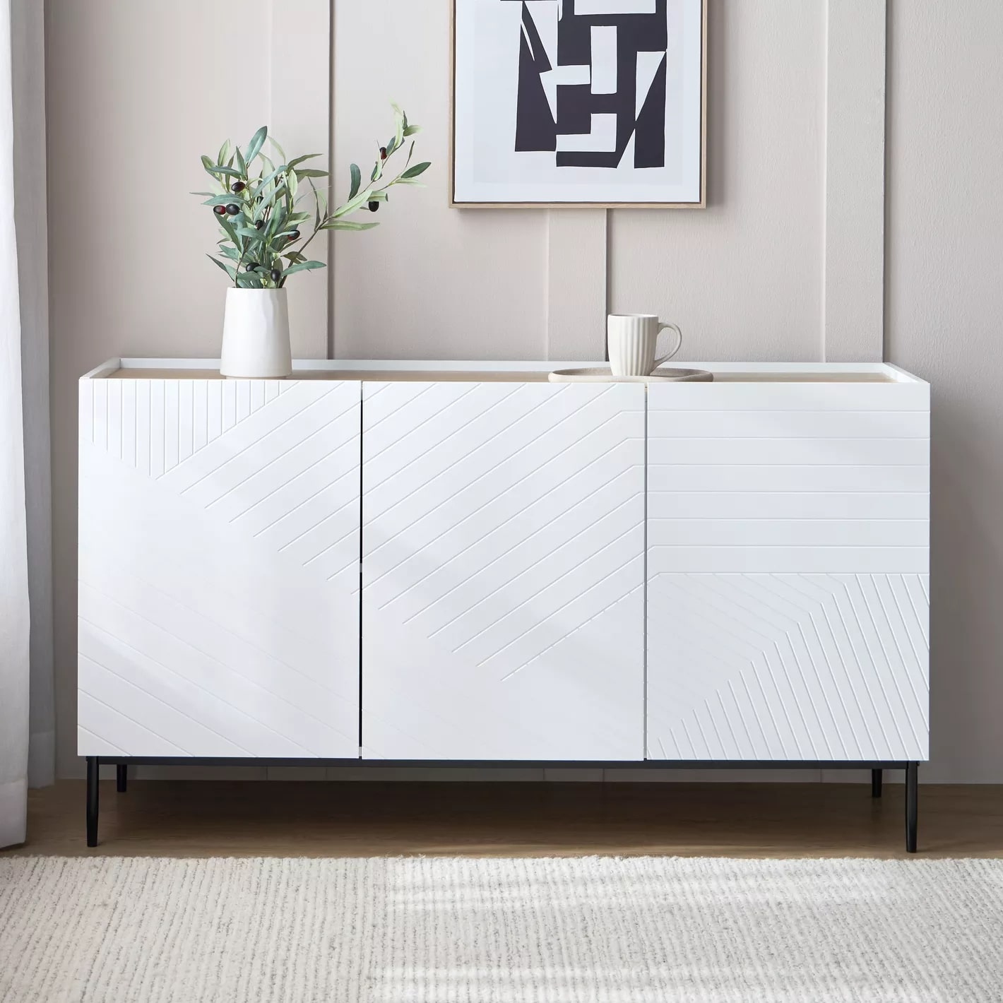 بوفيه خشبي بثلاثة أبواب، تصميم عصري ومساحة تخزين واسعة، مثالي لغرفة الطعام الحديثة.