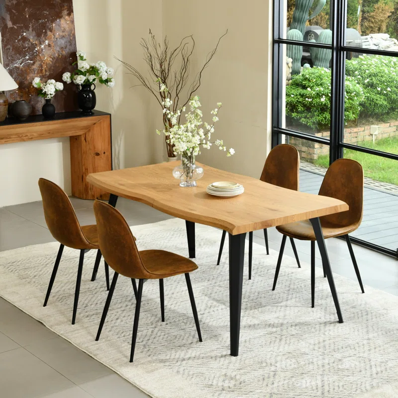 ارتقِ بمساحة تناول الطعام لديك مع هذا الطقم العصري المكوّن من 5 قطع، والذي يتميز بطاولة ذات سطح يُبرز عروق الخشب الطبيعي مع حافة غير منتظمة (تصميم "لايف إدج") وقاعدة معدنية سوداء متينة.
