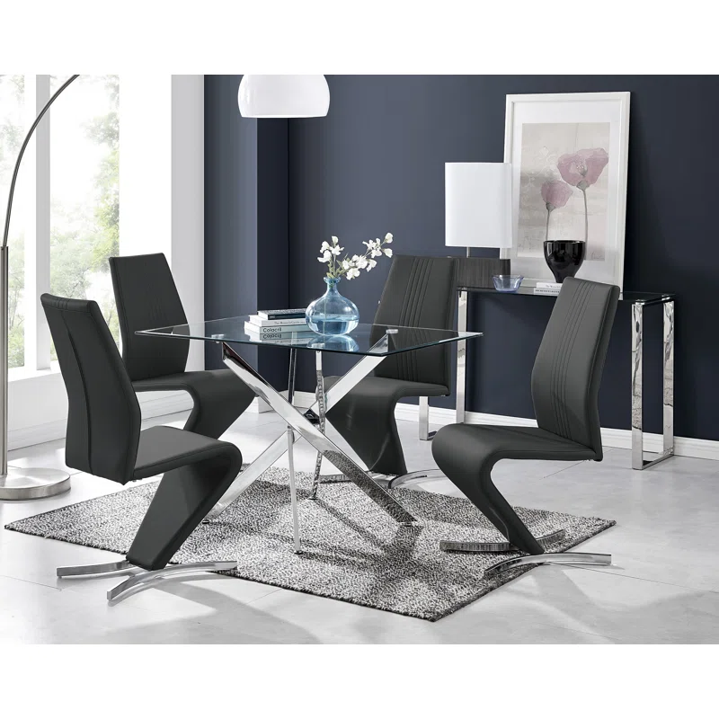 يُضفي هذا الطقم لمسة أنيقة وعصرية على غرفة الطعام، من خلال دمجه المبهر بين التصميم البسيط والطابع العصري الراقي، مما يضفي على المساحة إحساسًا بالاتساع والضوء. الطاولة مصنوعة من مزيج من المعدن الكرومي والزجاج المقوى الشفاف، ما يمنح المكان مظهرًا مشرقًا ومفتوحًا. وتتميز بسطح مشطوف واسع يتسع حتى 4 ضيوف بكل راحة، بينما يوفر الزجاج المقوّى مقاومة ممتازة للتلف والخدوش.