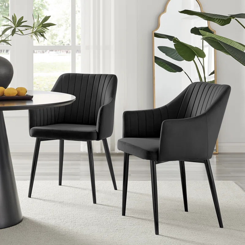 كرسيان طعام أنيقان من المخمل بتفصيل طولي وأرجل معدنية، يجمعان بين الراحة واللمسة العصرية لأي مساحة طعام.