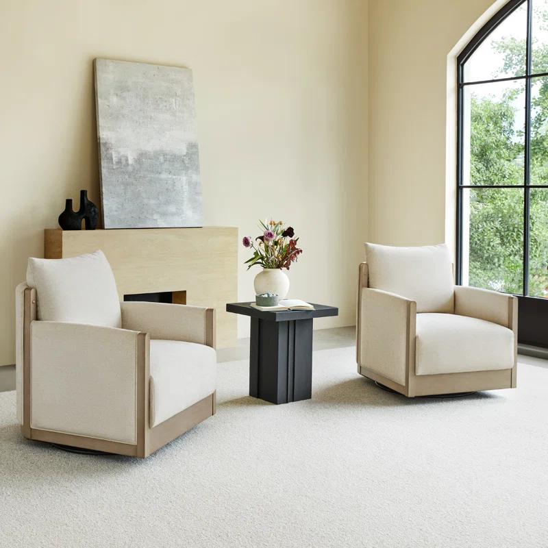 يتميز هذا الكرسي بأناقة مستوحاة من تصميم منتصف القرن بظهره المنحني ومسنديه المبطنين والمريحين. مصنوع من خشب صلب مجفف بالفرن وخشب هندسي، ويحتوي على قاعدة دوّارة سلسة بزاوية 360 درجة تمنحك مزيدًا من المرونة. يوفر المقعد المزوّد برغوة عالية الكثافة ونوابض داخلية مع مسند ظهر قابل للإزالة راحة فائقة.