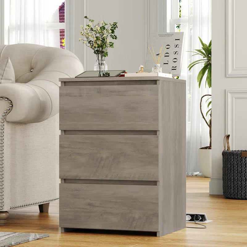كومود أنيق وعصري مزود بـ 3 أدراج ومخارج كهرباء وUSB لشحن أجهزتك بجانب السرير.